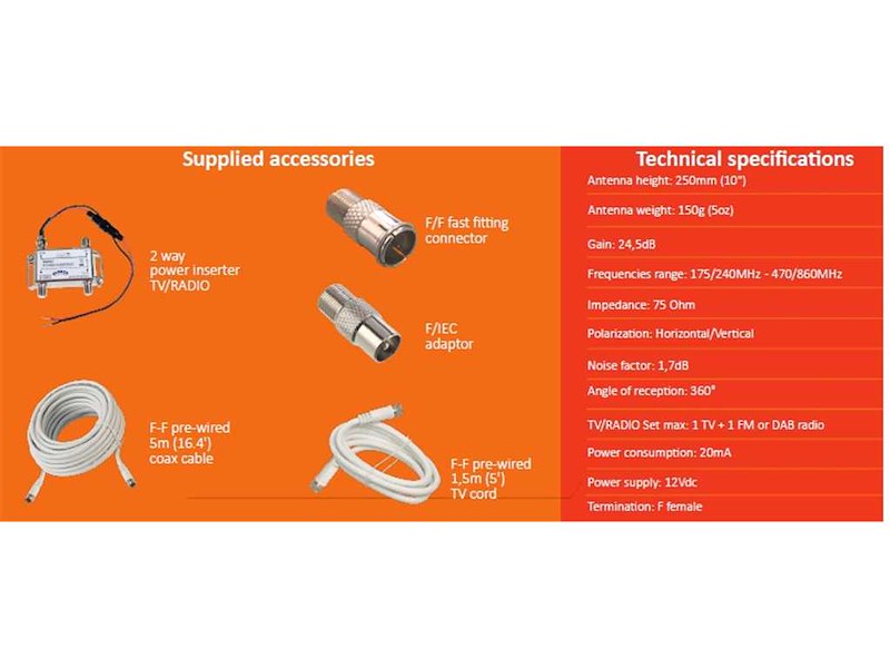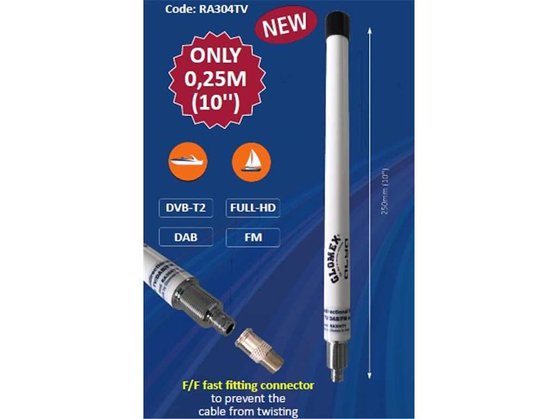 Antenna TV Glomex Alya RA304 super compatta. Ha un altezza di soli 25 cm, la Glomex ALYA offre una ricezione cristallina dei segnali DVB-T2, FULL-HD, DAB e FM. Fornita completa di amplificatore di segnale a 2 vie, cavo coassiale e connettori.