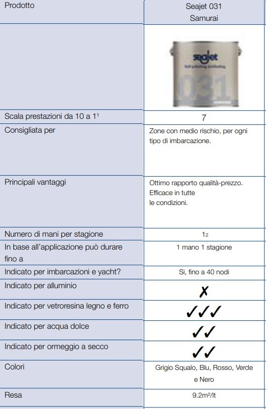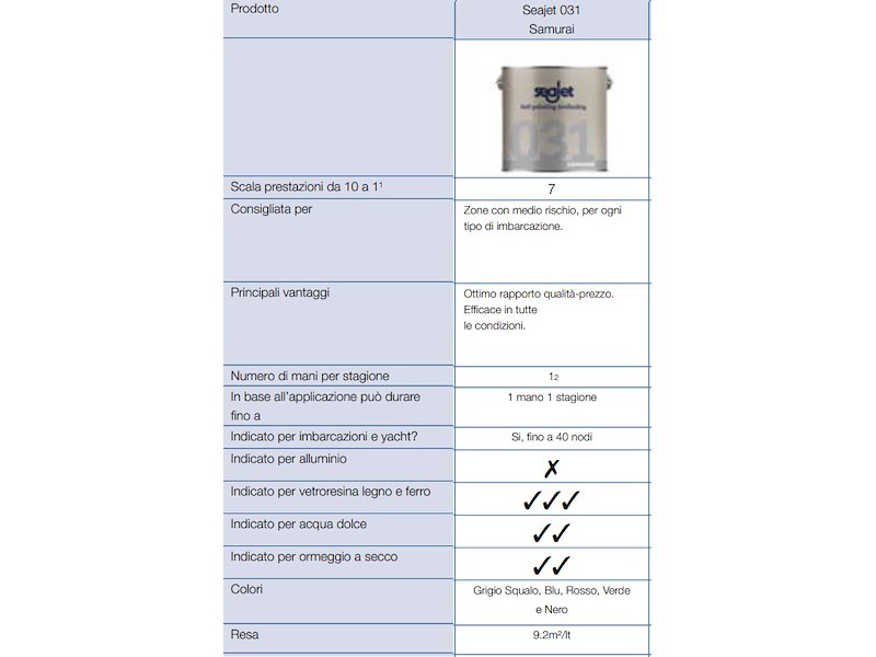 SEAJET 031 SAMURAI è un’antivegetativa autolevigante adatta per tutti i tipi di imbarcazione da diporto. Adatta a scafi fino a 40 nodi di velocità. NON UTILIZZARE su superfici in alluminio. Scheda tecnica in allegato.