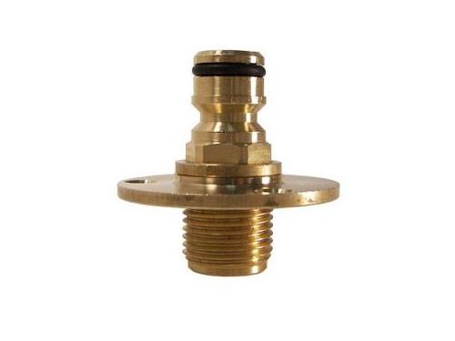 Raccordo maschio in ottone da 1/2" compatibile con tutti i sistemi rapidi in commercio in ottone e plastica, completo di rondella Ø mm. 50 con tre fori di fissaggio.