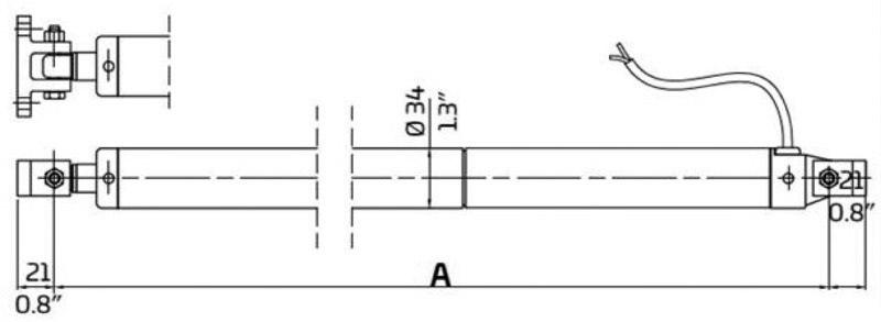 Montaggio singolo. Corpo Ø 34 mm, spinta massima 65 kg. Assorbimento 2 A a 12 V, velocità 4 mm/sec a 12 V, 6 mm/sec a 24 V. Con corpo in alluminio e stelo telescopico inox, impermeabile IP65. Apertura totale o parziale del portellone in tutte le posizioni volute. Non si possono montare in coppia.