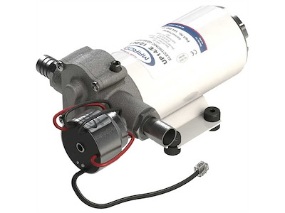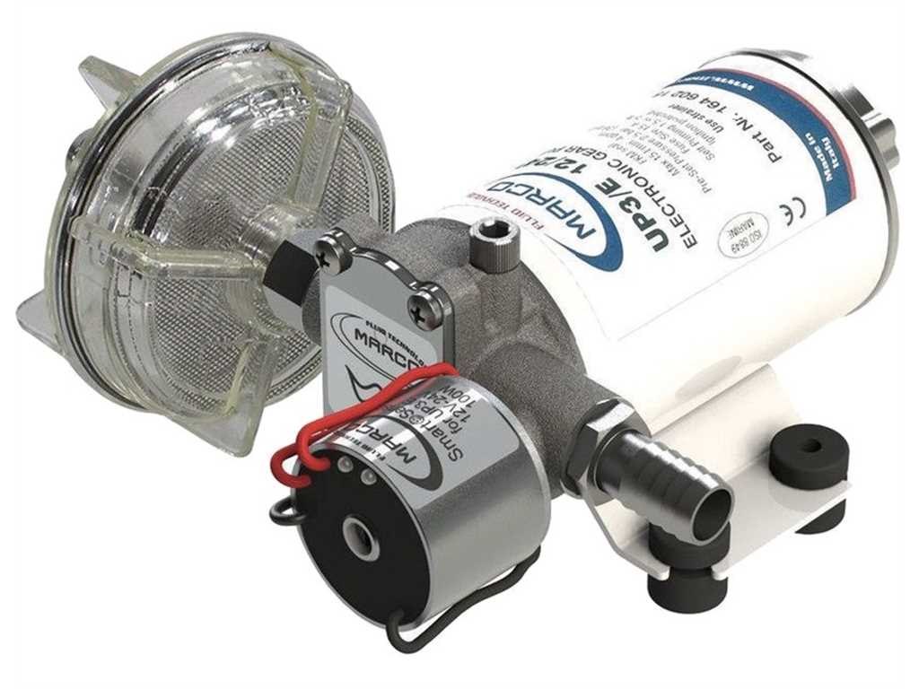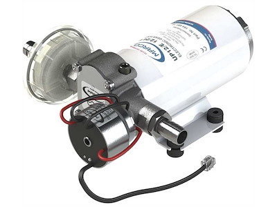 Velocità variabile proporzionale alla richiesta idrica. Pressione costante. Non richiede accumulatore di pressione. Voltaggio universale 12/24 V. LED verde: segnalazione pompa operativa. LED blu: segnalazione serbatoio vuoto. Protezione contro corto circuiti e sovratensioni. Corpo in ottone nichelato, alberino in acciaio inox, girante elicoidale in PTFE autolubrificante.