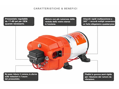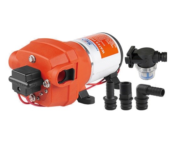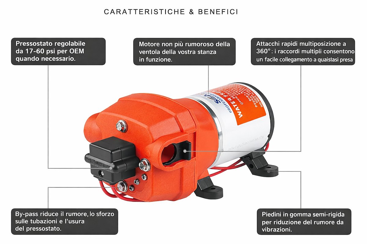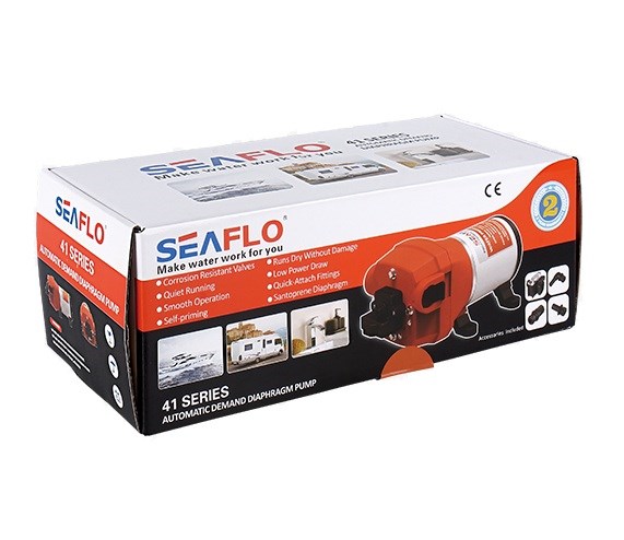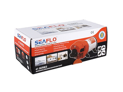 Autoclave per barche SeaFlo completa di pressostato. Può girare a secco senza rovinarsi. Il bypass interno riduce notevolmente le pulsazioni per un flusso d'acqua costante. È progettata per funzionare in impianti idrici anche senza serbatoio di accumulo, ed alimenta fino a cinque utenze. Fornita con attacchi rapidi e filtro acqua. Portata 12,5 Litri/minuto .