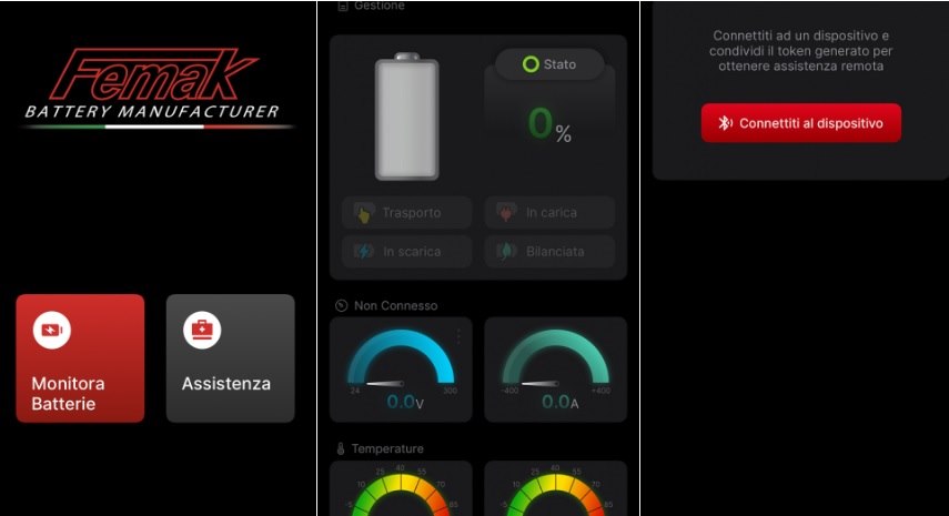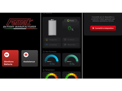 FEMAK BATTERY REMOTE CONTROL è la App dedicata a tutti i possessori di batterie Femak e grazie al modulo Bluetooth permettere di monitorare la propria batteria in ogni momento visualizzando le principali funzioni e criticità come: