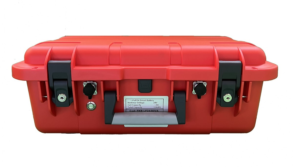 Batteria Litio Femak realizzata in box plastico ermetico con maniglia per agevolare il trasporto. Capacità 75 Amper. 36 Volt. Dimensioni 59,5 x 40 x 21,5 cm. Peso 27,70 kg.