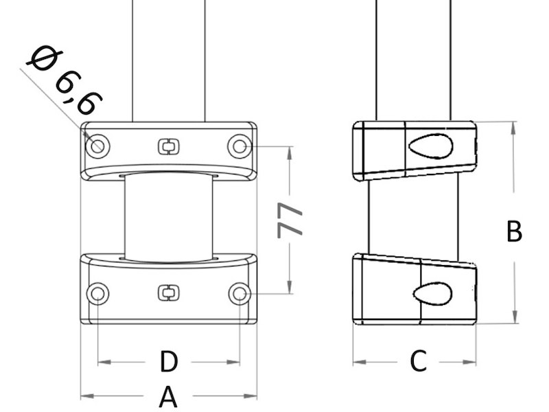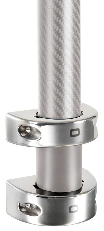 Formata da un doppio supporto, inferiore e superiore, a parete per palo tendalino. Il palo ruota di 90° all'interno del supporto e rimane bloccato. Sistema ad alta finitura estetica grazie alla superficie lucidata a specchio e logo frontale. Fissaggio a parete tramite due viti svasate M6x40 o più lunghe. Supporto inferiore cieco. Supporto superiore passante. Per pali da Ø 38 mm. - Misure: A 92 mm. - B 106 mm. - C 65 mm. - D 74 mm. .