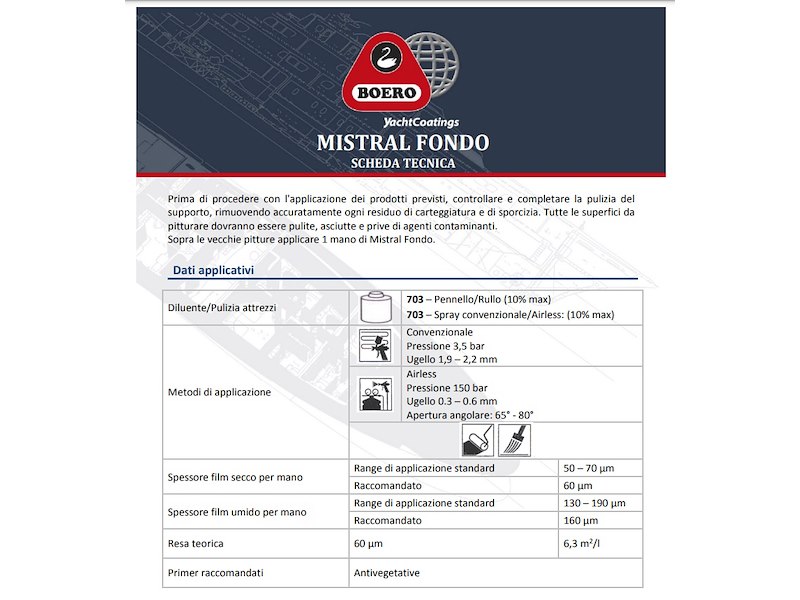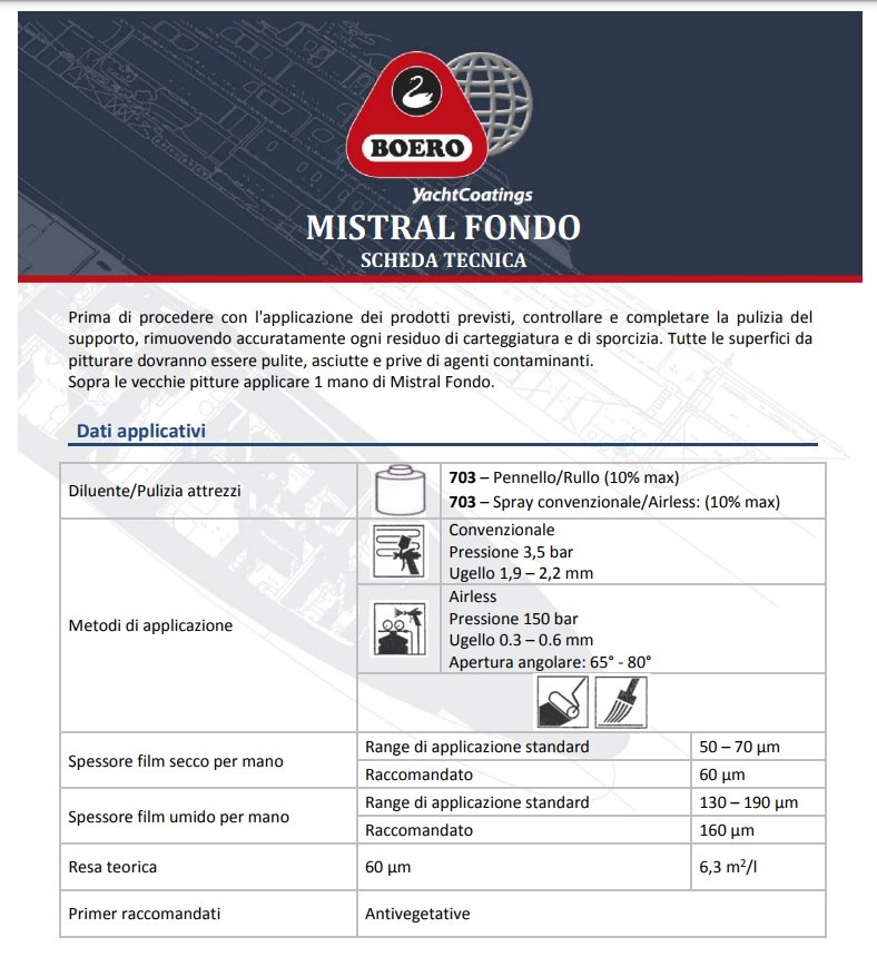 Fondo anticorrosivo monocomponente al clorocaucciù, ad alto potere impermeabilizzante, formulato per superfici immerse. È ideale come mano isolante su vecchie antivegetative di cui non si conosce la natura prima dell'applicazione della nuova antivegetativa. Consente di ottenere alti spessori e crea un vero "effetto barriera" tra l'acqua e la superficie trattata. Si applica anche su acciaio e legno opportunamente preparati sia all'esterno che all'interno dell'imbarcazione. È anche consigliato come mano di fondo su superfici emerse in cicli monocomponenti. Resa teorica m² 5,3 - Numero di mani 1/3 - Ricopribile min. 8 h - Carteggiatura 30 h - Diluente 703.