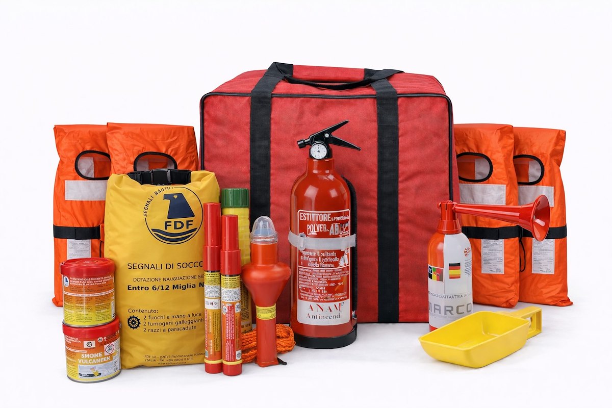 Il kit include dotazioni omologate e selezionate per garantire sicurezza, ordine e rapidità di utilizzo a bordo, ed è fornito in borsa robusta e facilmente stivabile.