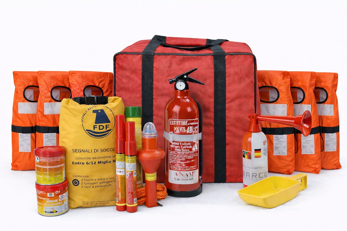 Il kit include dotazioni omologate e selezionate per garantire sicurezza, ordine e rapidità di utilizzo a bordo, ed è fornito in borsa robusta e facilmente stivabile.