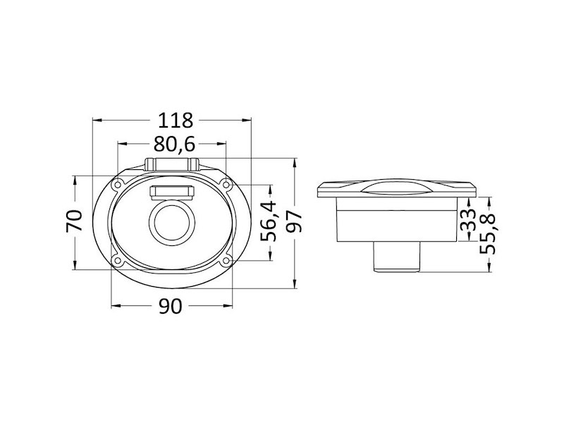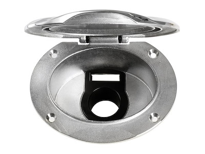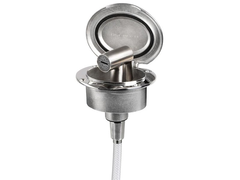 Vano doccia in acciaio inox AISI 316 con sportello autoreggente. Dotato di doccia Tiger in acciaio inox e boccola interna in gomma antivibrante.