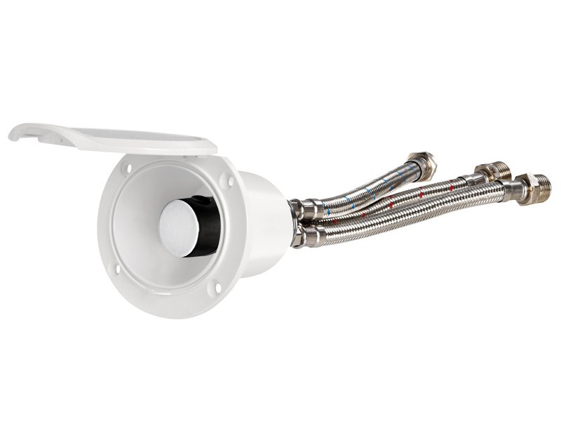 Box doccia Nuvola con rubinetto in ottone cromato e miscelatore in ceramica. Box in ASA con inserto in acciaio inox AISI 316.