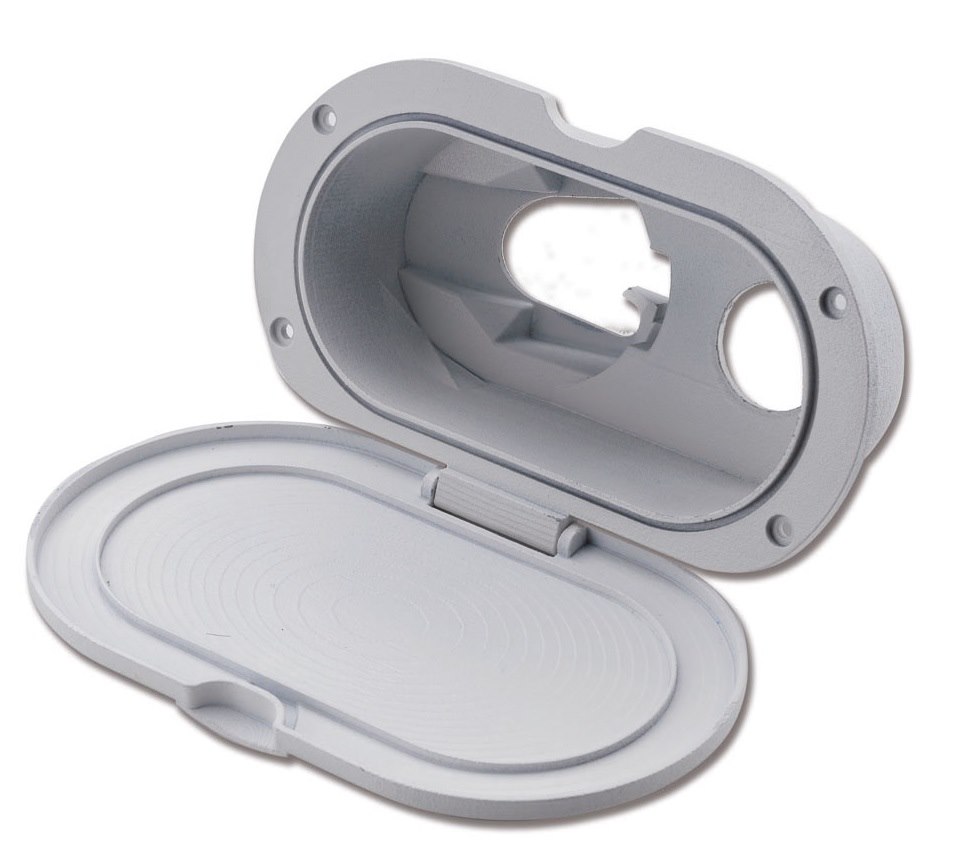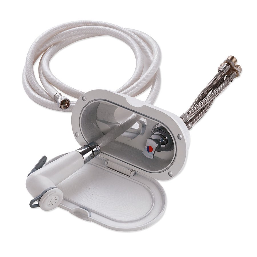 Box doccia ovale completo di miscelatore ( acqua calda/fredda ), tubo retinato da 4 metri e doccetta a telefono a levetta. Colore bianco in ASA UV resistant. Attacchi miscelatore 3/8". Dimensioni esterne box 185 x 110 mm. Incasso 145 x 72 mm. .
