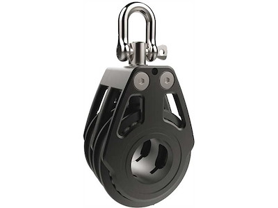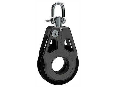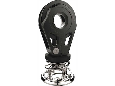 Bozzello LEWMAR Racing singolo con golfare su molla per carichi elavati, con puleggia da 60 Ø mm, carico max di lavoro 800 kg, diametro massimo cima Ø 12 mm.