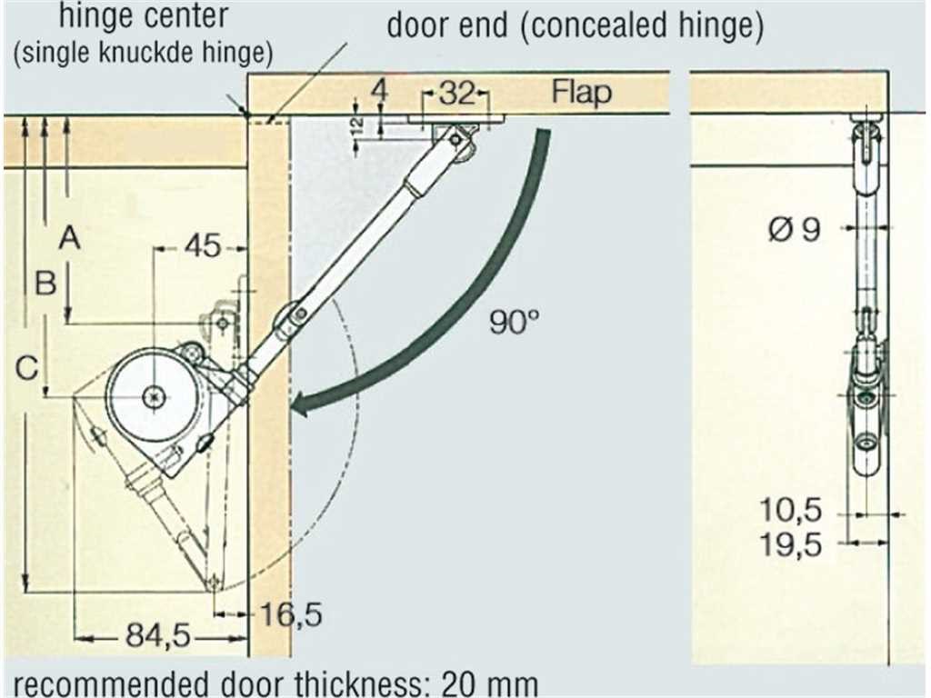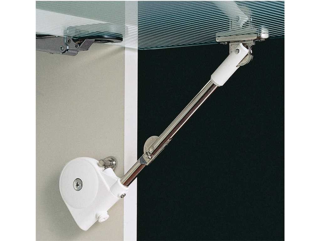 Una volta alzato lo sportello il braccetto lo tiene in posizione, alla chiusura il braccetto ammortizza la discesa fino al completo arresto dell’antina. Colore bianco. Venduto completo di piastrina di montaggio. Calcolo momento torcente. Un braccetto: lunghezza antina (cm) x 1/2 x peso antina (kg) = 40 - 70 kg.cm