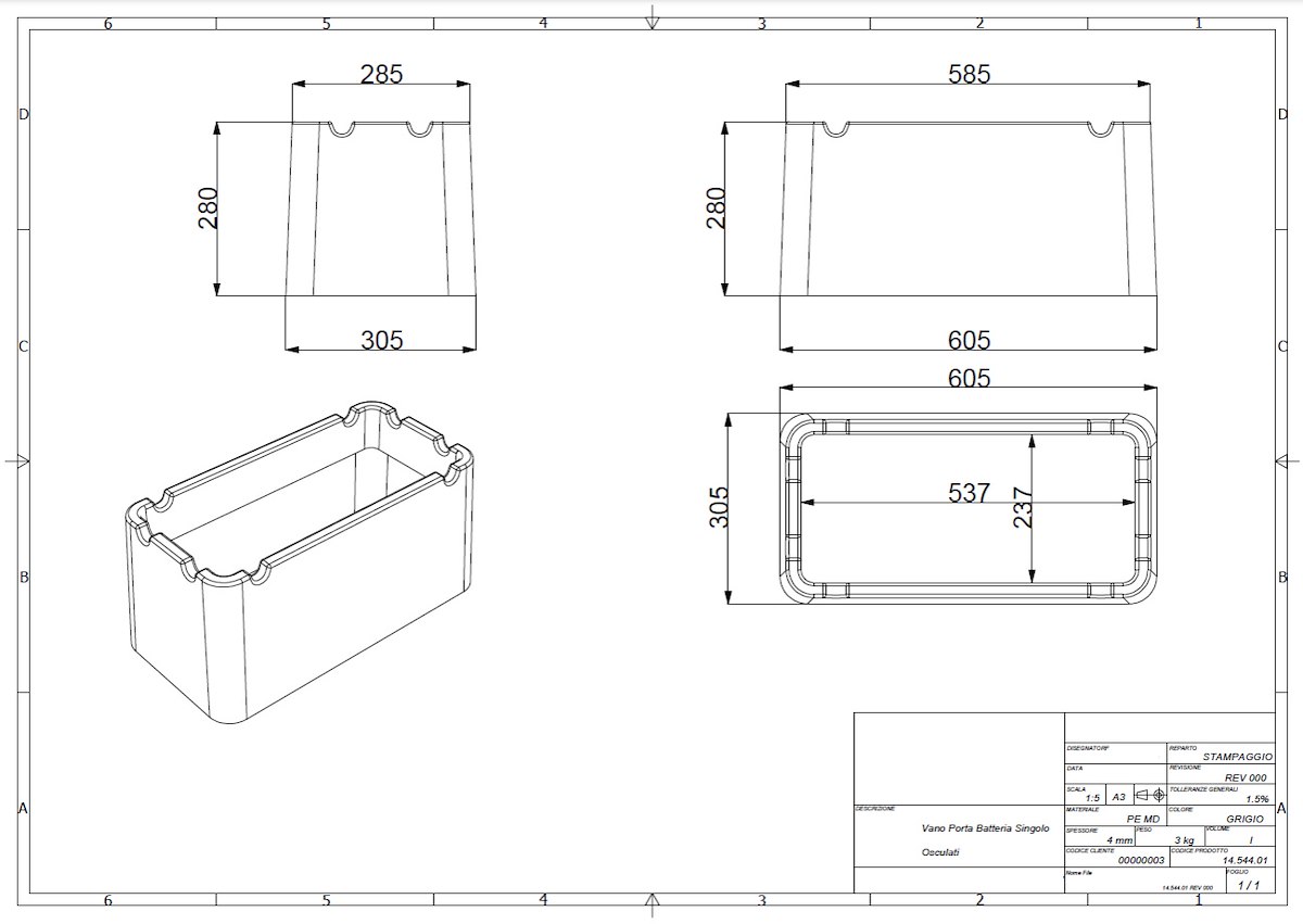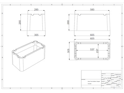 Fabbricata in polietilene, completa di coperchio. Progettata per contenere le batterie di grande capacità, da 120 a 200 Ah.