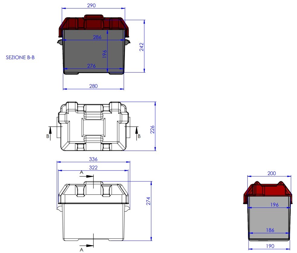 Cassetta portabatteria piccola. Fabbricata in polipropilene antiurto. Munite di cinghia con fibbia di regolazione per la chiusura del coperchio.