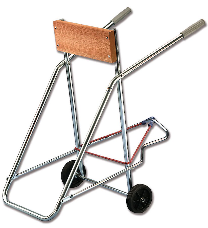 Carrello portamotore pieghevole barca, fabbricato con tubo in acciaio zincato con portaserbatoio. Provvisto di ruote in gomma maniglie e portaserbatoio con molla di fissaggio.