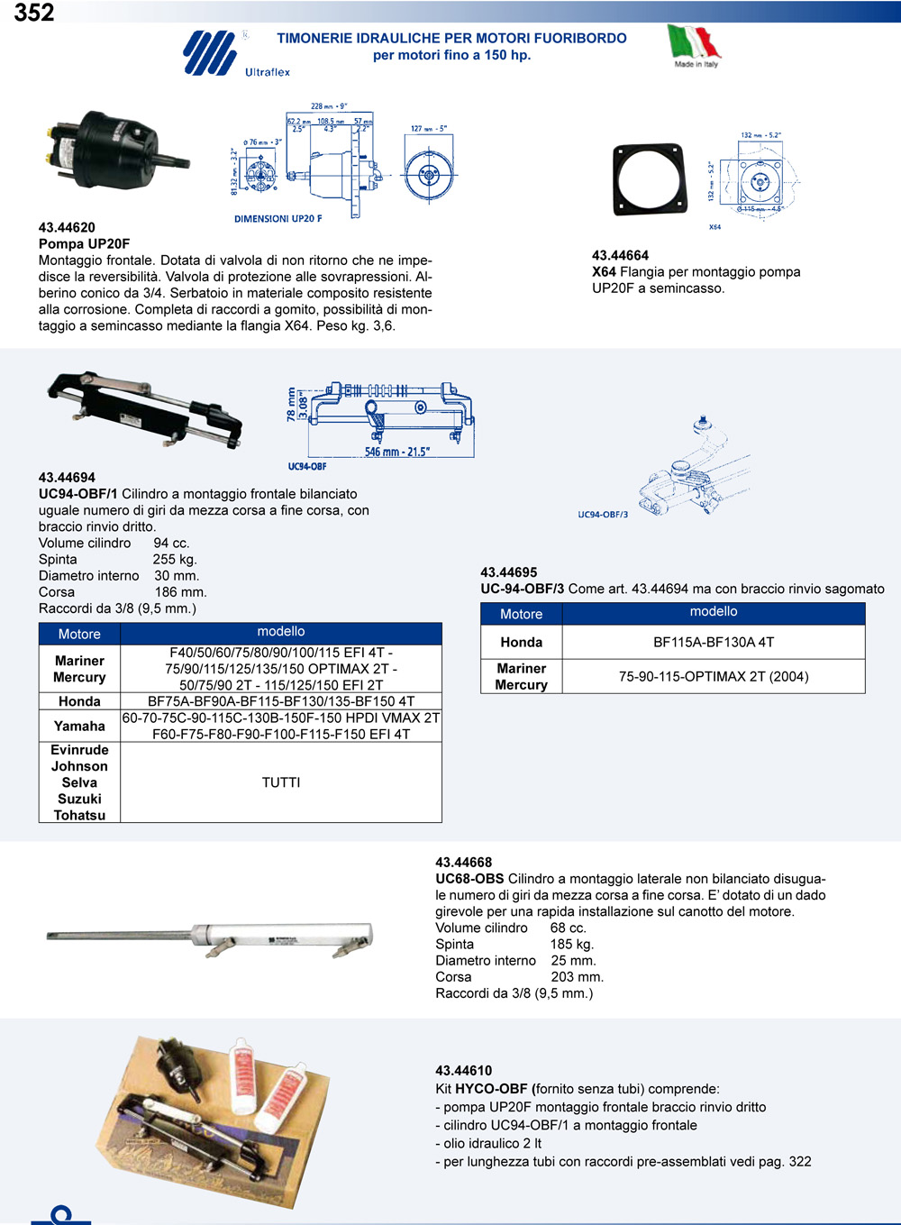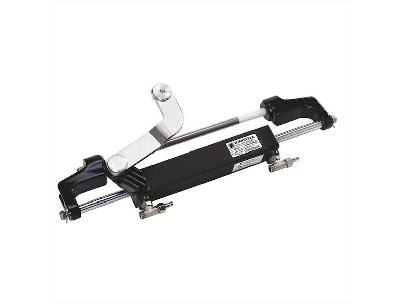Cilindro Ultraflex UC95-OBF/3 con braccio rinvio sagomato. Adatto a motori fuoribordo di potenza fino a 150 HP. Bilanciato, uguale numero di giri da mezza corsa a fine corsa, con braccio rinvio dritto. Volume cilindro 94 cc. Spinta 278 kg. Diametro interno 30 mm. Corsa 186 mm. Raccordi da 3/8 (9,5 mm.). Adatto a motori fuorbibordo Honda BF115A - BF 130 A 4T e Mercury 75-90-115-OPTIMAX 2T (2004) . Consultare l'allegato per visualizzare i motori fb compatibili e dimensioni di ingombro del cilindro.