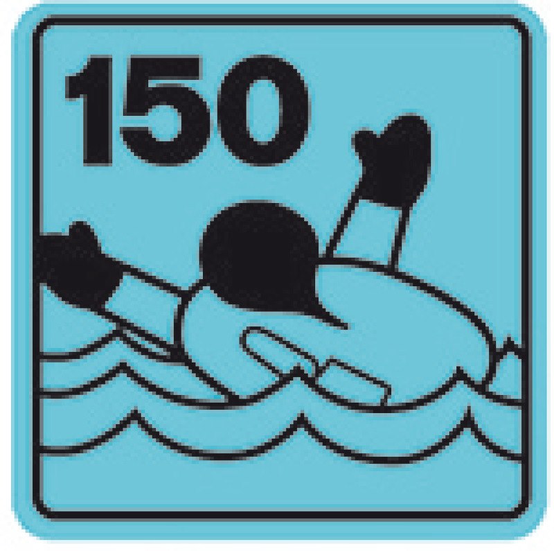 Giubbino di salvataggio 150 N conforme alla nuova normativa EN ISO 12402-3 . Dotato di nastri riflettente e cinghia sgancio a rapido. Modello compatto con sistema di piegatura del collo che riduce del 25% l'ingombro di stivaggio. Questa versione da 150N è omologato alla navigazione oltre 6 miglia dalla costa ( deve essere abbinato alla luce automatica di segnalazione ns sku 14213 )
