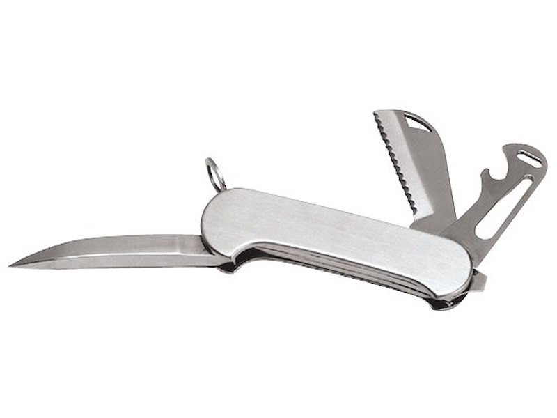 Coltello in acciaio inox per vela. Completo di aprigrilli, punteruolo per impiombature con blocco, apribottiglie, cacciavite, slamatore per ami. Lunghezza lama: 70 mm. .