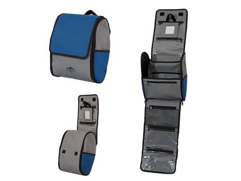 Contenitore pieghevole portaoggetti. Studiato per essere appeso in spazi ridotti e fungere da armadietto a ripiani. Chiuso svolge la funzione di una normale trousse. Realizzato in materiale impermiabile.
