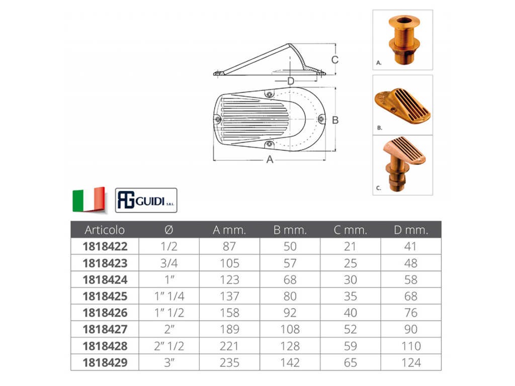 Cuffia in bronzo, modello Manta. Abbinata allo scarico a mare si crea una presa a mare.