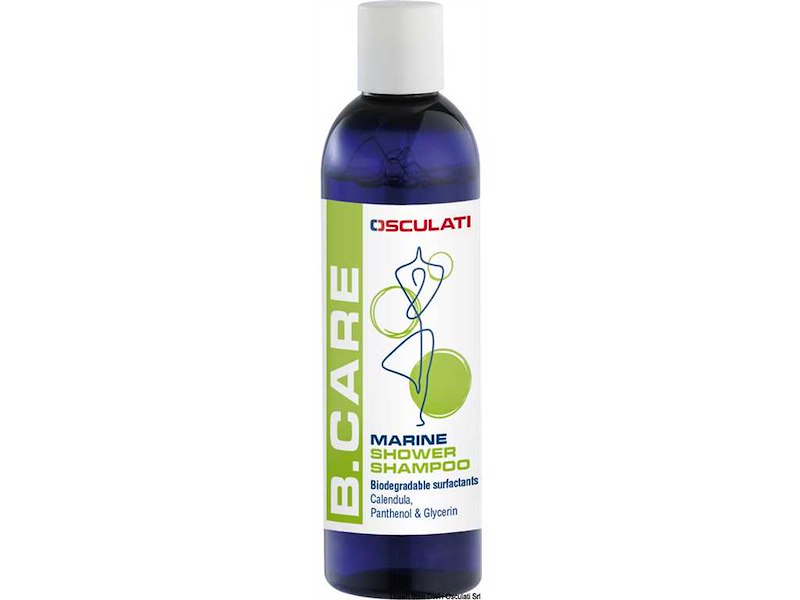 Osculati B-Care doccia shampoo marino. Contiene detergenti delicati ad alta biodegradabilità fino a 200 volte meno tossici per alghe e pesci, con ingredienti attivi delicati di origine naturale, scelti dalla migliore ricerca scientifica, con attività lenitiva, rinfrescante ed idratante.
