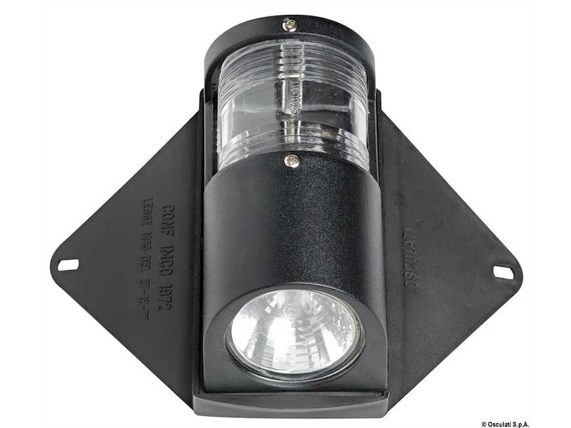 Faro alogeno da coperta completo di luce di prua per imbarcazioni fino a 12 metri. Corpo in Tecnopolimero a perfetta tenuta stagna rinforzato con alette flessibili per il montaggio ad albero.