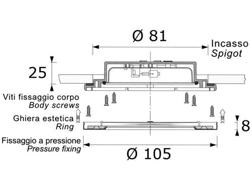 Dimensioni : Ø esterno 105 mm. - Ø incasso 81 mm. - Profondità incasso 25 mm. .