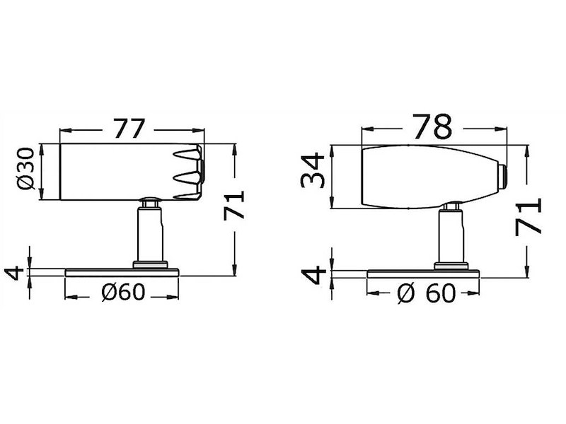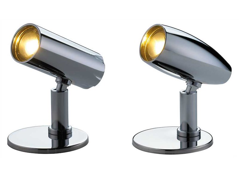 Corpo in acciaio inox lucidato a specchio, testa in alluminio cromato. Interruttore sul retro della testa.