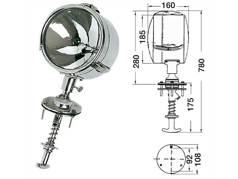 Faro di profondità orientabile dall'interno DHR, 24 V, portata 1200 m, Ø 185 mm.