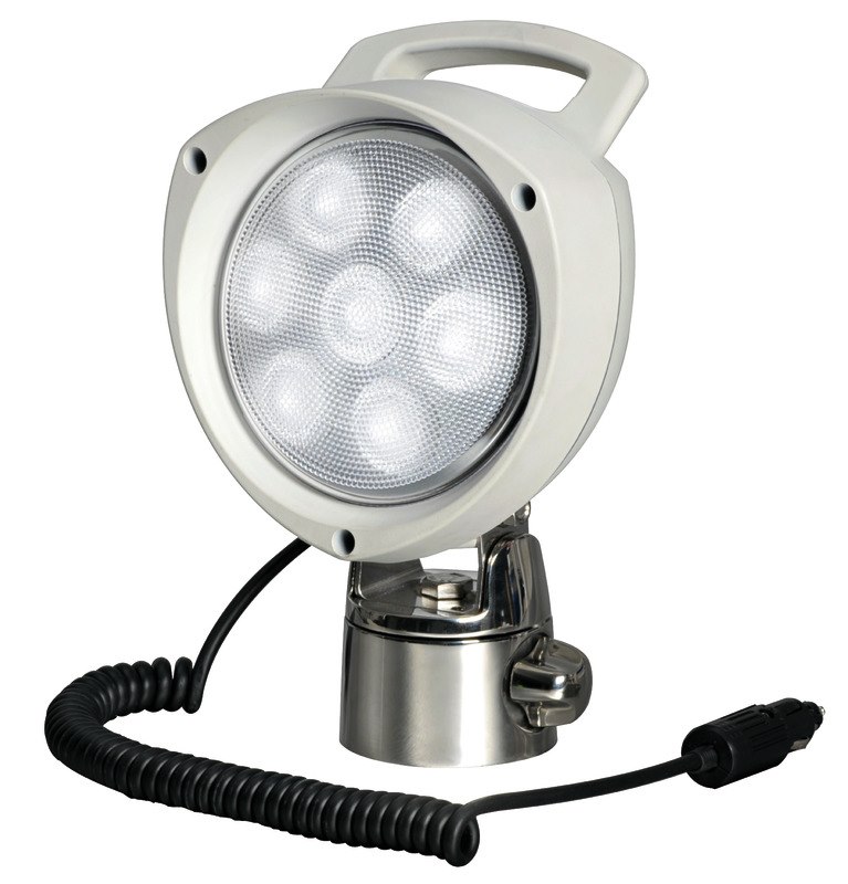 Faro portatile snodato sfilabile dalla base. Carcassa in nylon rinforzato, con basetta in acciaio inox. Cordone elettrico estensibile con spina tipo accendino. Interruttore a bilanciere. Equipaggiato con 7 LED da 3 watt - Potenza led 21 watt - Alimentazione 12/24 volt - Lumen 2000 - Gradazione luce 5000-6500 k - Angolo LED 50°.