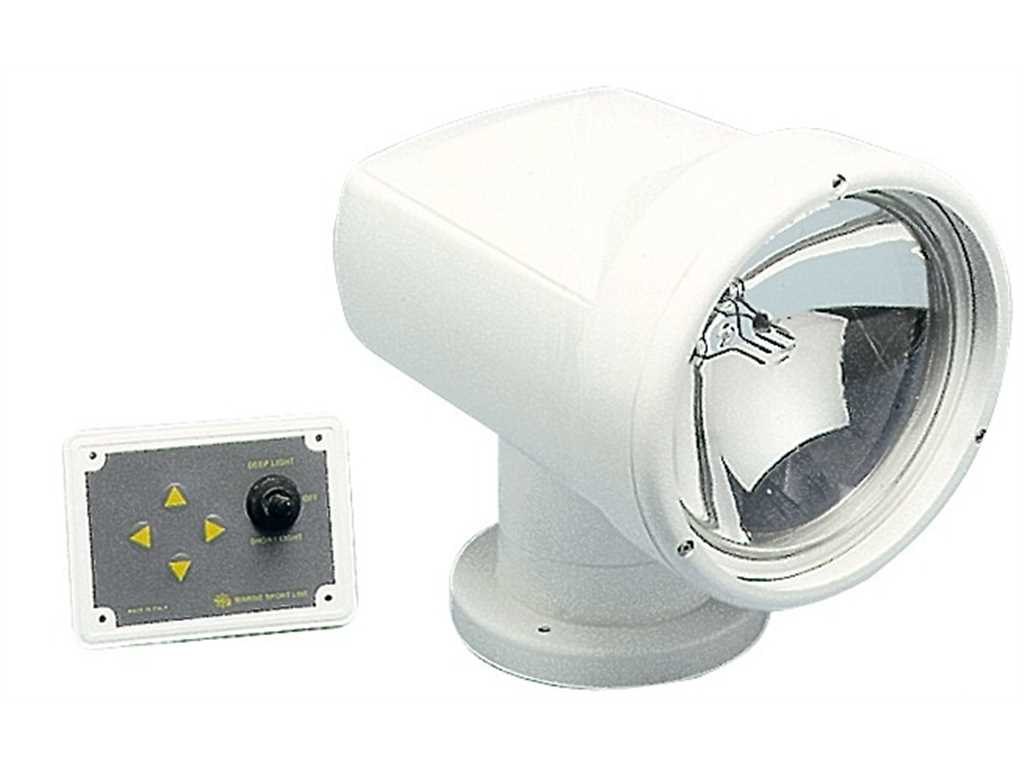 Con bulbo stagno alogeno BLUE EYE da 5”3/4 pollici, provvisti di doppio filamento. Produce luce corta a largo fascio (100 m) oppure luce di profondità (250 m) a cono stretto. Rotazione a 355°, alto e basso70°. Completi di pannello di comando multifunzioni. Carcassa bianca in ABS UV resistente.