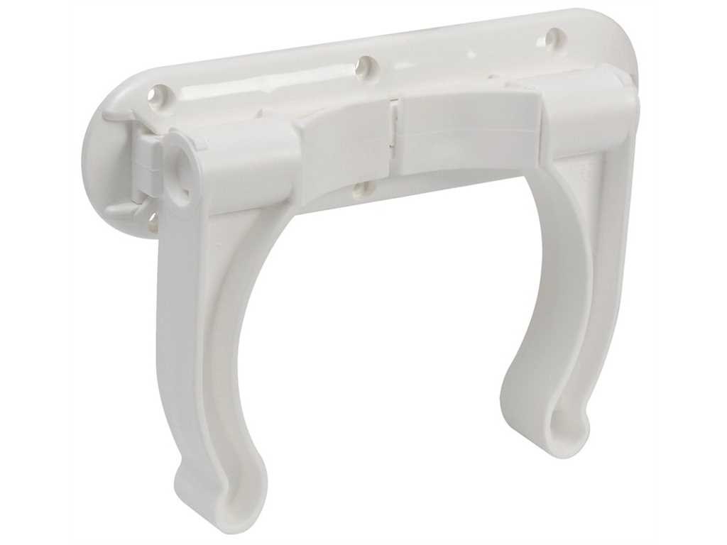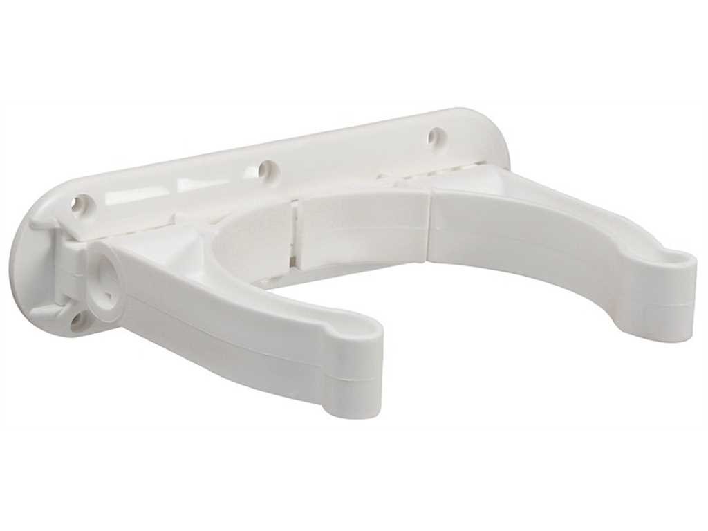 Sistema di fissaggio a parete per le bombole da sub, universale. Viene fornita una base in nylon a slitta, da fissare a parete, nella quale si inserisce la staffa portabombola che é regolabile in larghezza e pieghevole. Il tutto é fabbricato in polipropilene bianco.