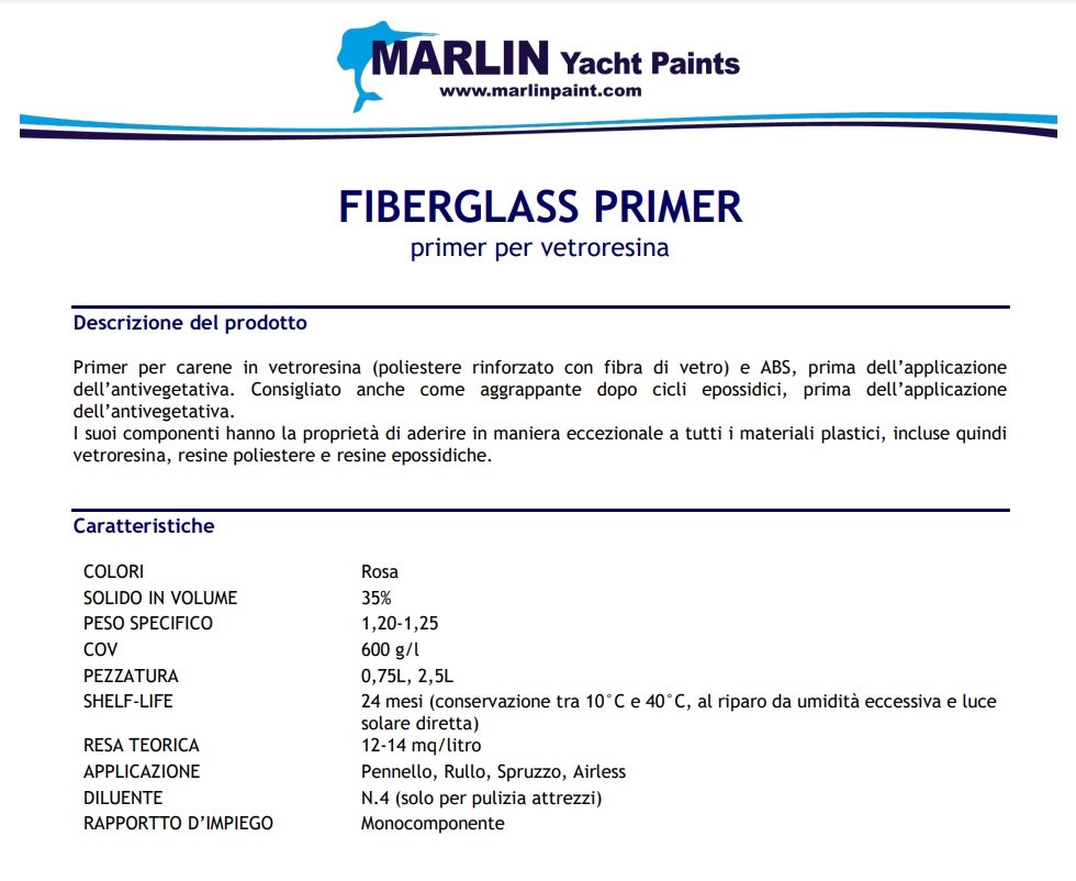 Fiberglass primer barca Pesle Marine Paints. Primer per carene in vetroresina e ABS. I suoi componenti conferiscono un'aderenza eccezionale su a gelcoat, resini poliestere, resine epossidiche. Applicare prima di antivegetative autoleviganti e di tipo tradizionale .