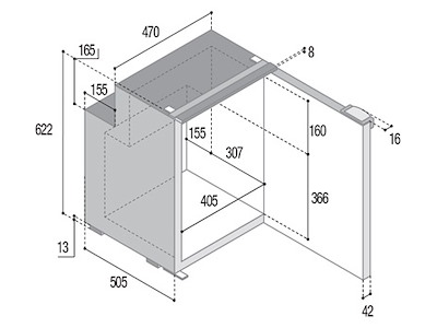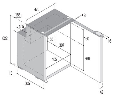 - Dimensioni: 622 mm. altezza - 470 mm. larghezza - 505 mm. profondità (+ 42 mm per lo sportello)
