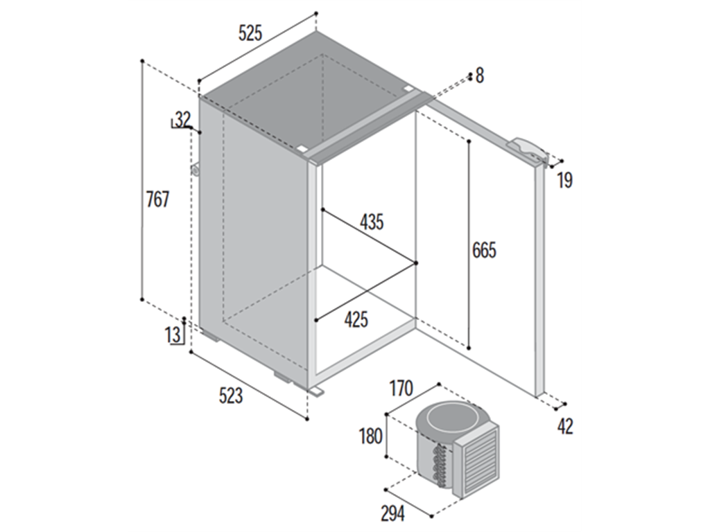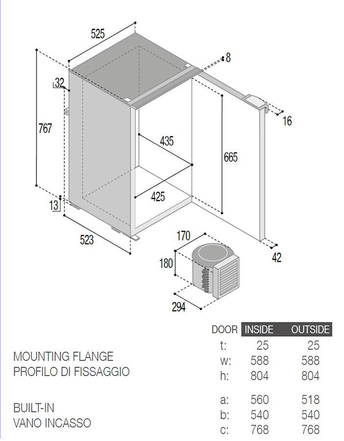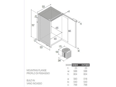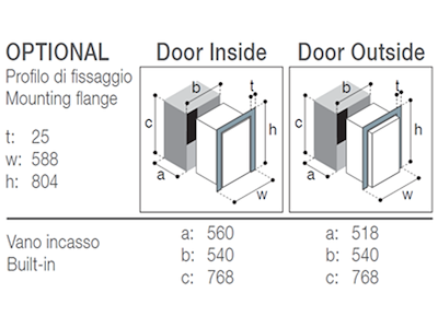 - Dimensioni: 767 mm. altezza - 525 mm. larghezza - 565 mm. profondità (+ 42 mm per lo sportello)