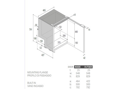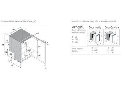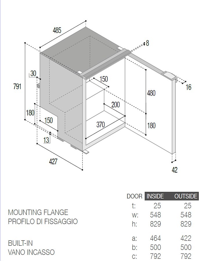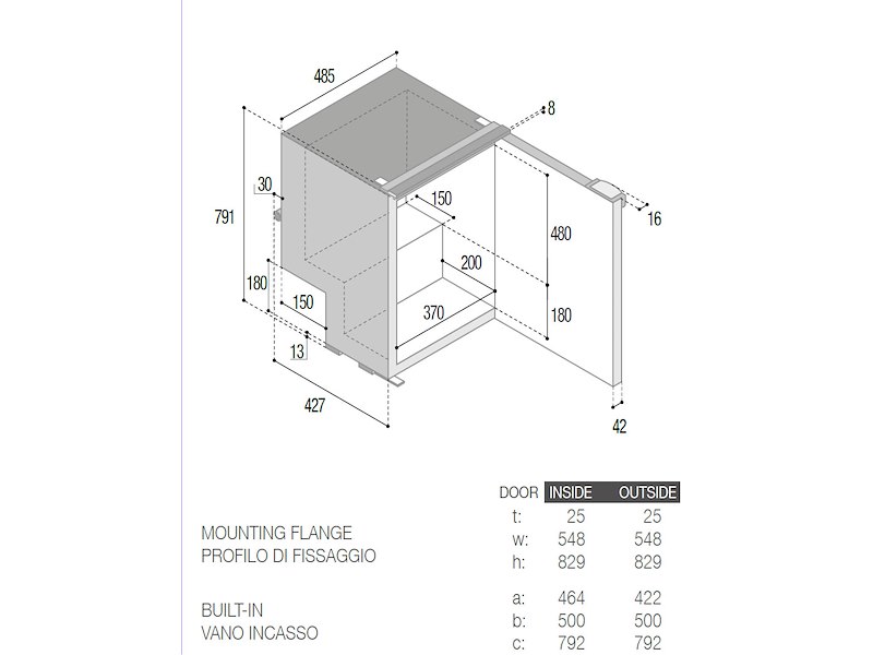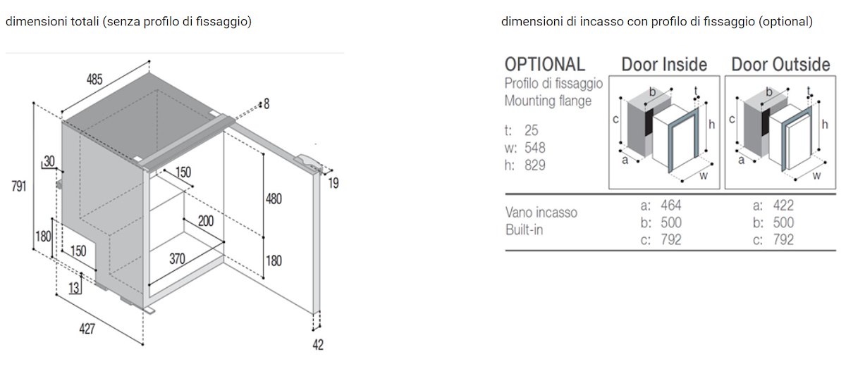 - Misure : Larghezza 485 x Profondità 415 + 42 per la porta x Altezza 789 mm.