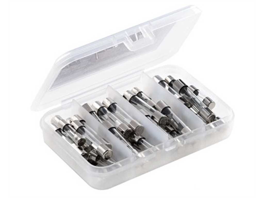 Compsto da 24 fusibili 5 x 20 mm. dei seguenti amperaggi: 6 da 1A - 6 da 2A - 6 da 5A - 6 da 10A. Più 24 fusibili 6,3 x 32 mm. dei seguenti amperaggi: 6 da 5A - 6 da 10A - 6 da 15A - 6 da 20A.