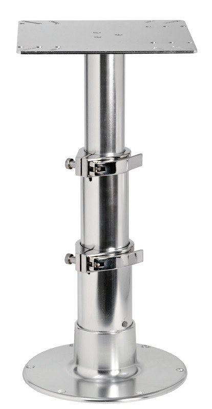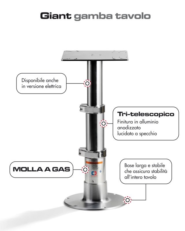 Fabbricata in alluminio lucidato a specchio ed anodizzato. Collari di fissaggio in acciaio inox che rendono la gamba molto stabile e robusta. Completa di molla a gas per la risalita. Non necessita di forare il pavimento per la discesa. Tri-telescopica. Altezza 345/714 mm. - Base extra-piatta Ø 305 mm. - Tubi Ø 100/88/72 mm. - Piastra tavolo 305x305 mm. .
