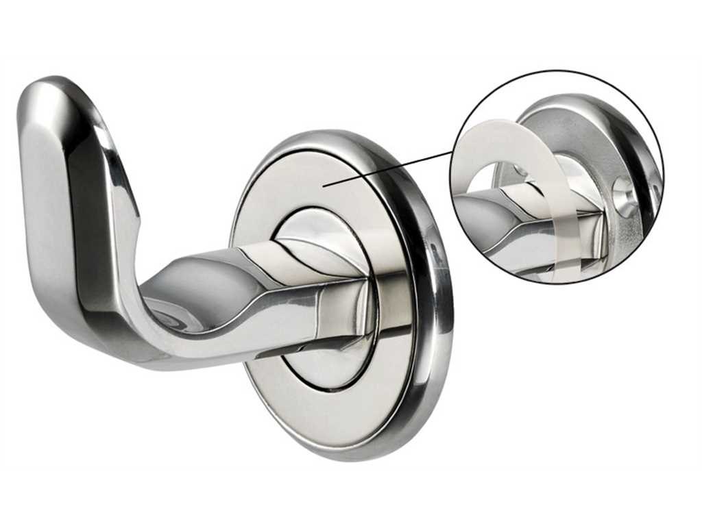 In acciaio inox AISI 316 lucidato a specchio. Le viti vengono mascherate da una ghiera, sempre inox AISI 316 lucido, autoadesiva.