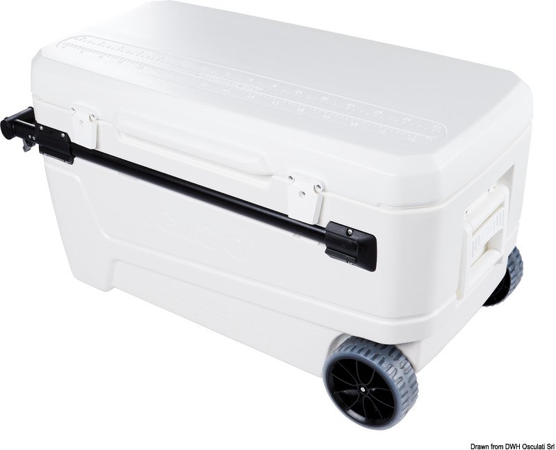 Ghiacciaia marina portatile IGLOO con ruote e maniglia per barca. Le più famose ghiacciaie "made in USA", rispondono ai più elevati standard qualitativi e di durata. Appositamente costruite per l'uso a bordo. Ideali per la conservazione degli alimenti, del pescato o come vasche per esche vive. Ottimamente isolate, cassa in ABS BIANCO resistente ai raggi U.V., interno in materiale plastico ed inodore. Robustissime, si possono usare anche da sedile.