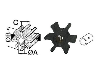 Girante di concorrenza per motore entrobordo Volvo. Numero originale: 50035 oppure 21951362. Dimensioni: Ø A 25,4 mm. ; Ø B 95 mm. ; C 63,1 mm. . Pale: 12. Tappo in dotazione.