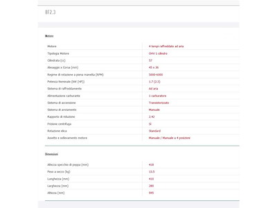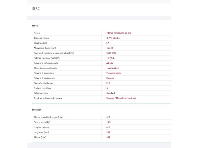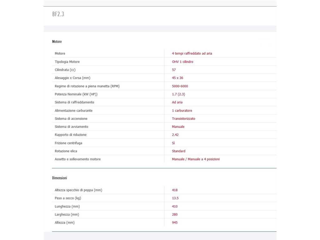 Altezza specchio di poppa (mm) 418 - Peso a secco (kg) 13.5 - Lunghezza (mm) 410 - Larghezza (mm) 280 - Altezza (mm) 945 .