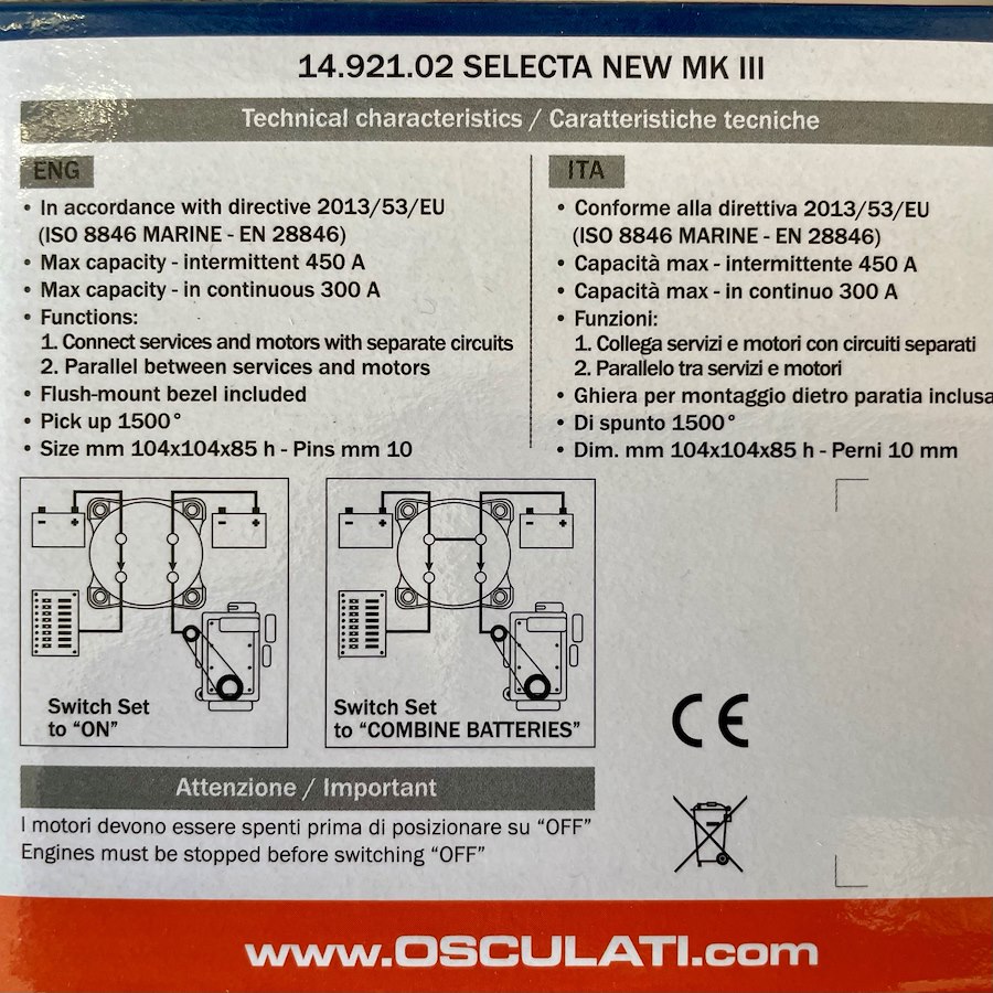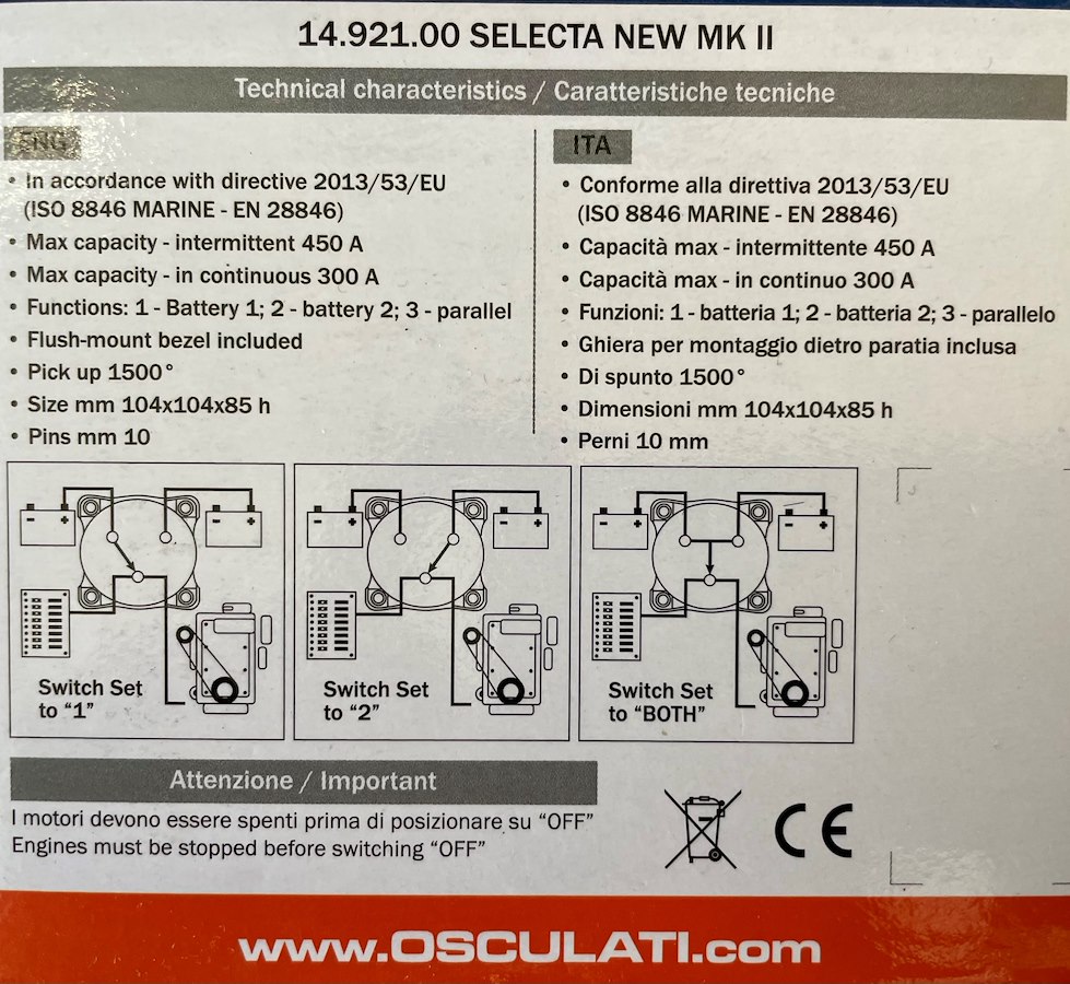 A) Versione MK II. Opzioni selezionabili: banco/batteria "1", banco/batteria "2" oppure bancate 1+2 simultaneamente. Completo di dispositivo che disconnette automaticamente l'alternatore se viene attivata la funzione "OFF" senza aver spento i motori. Numero di omologazione: DIP006907SP.