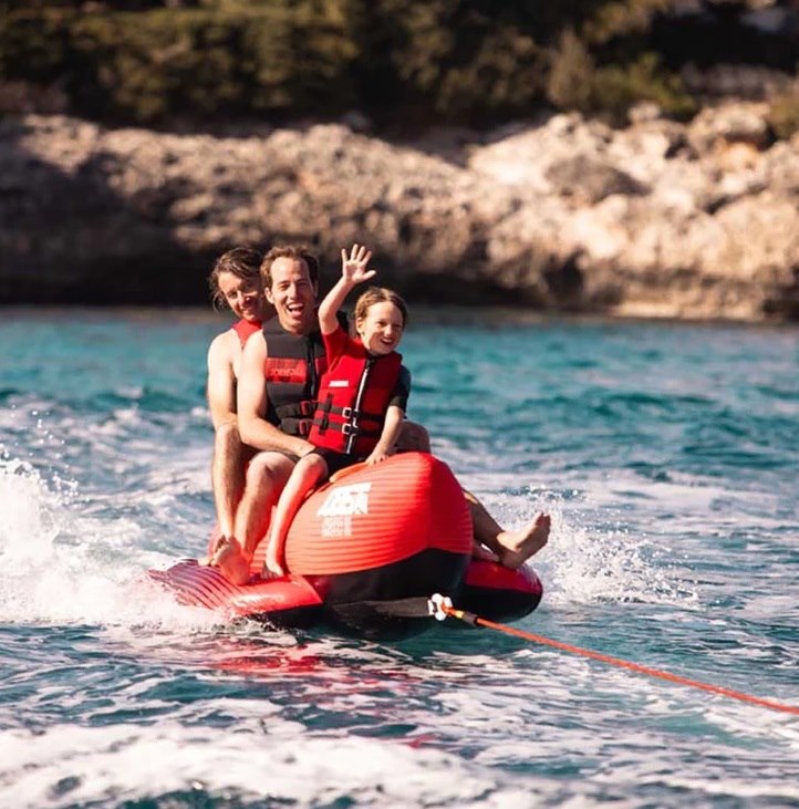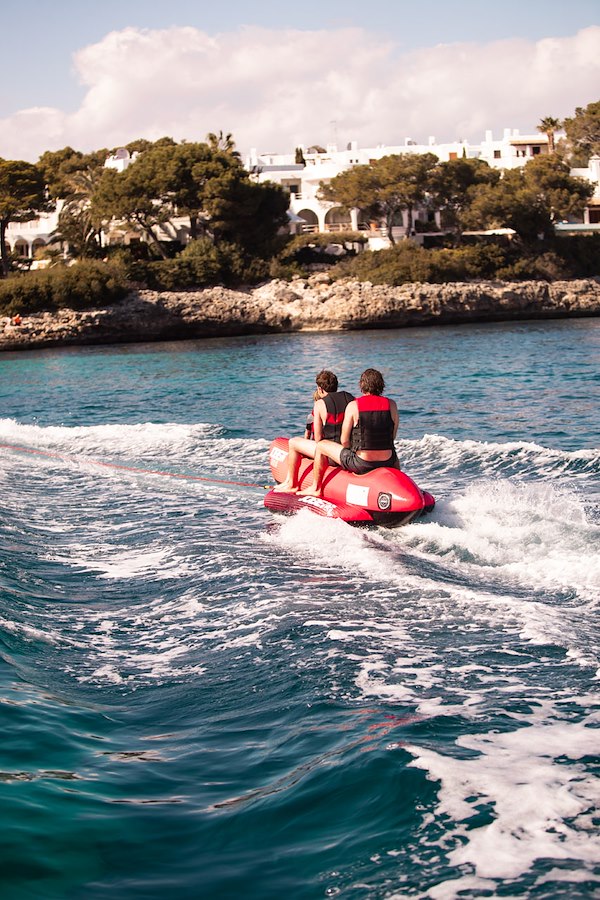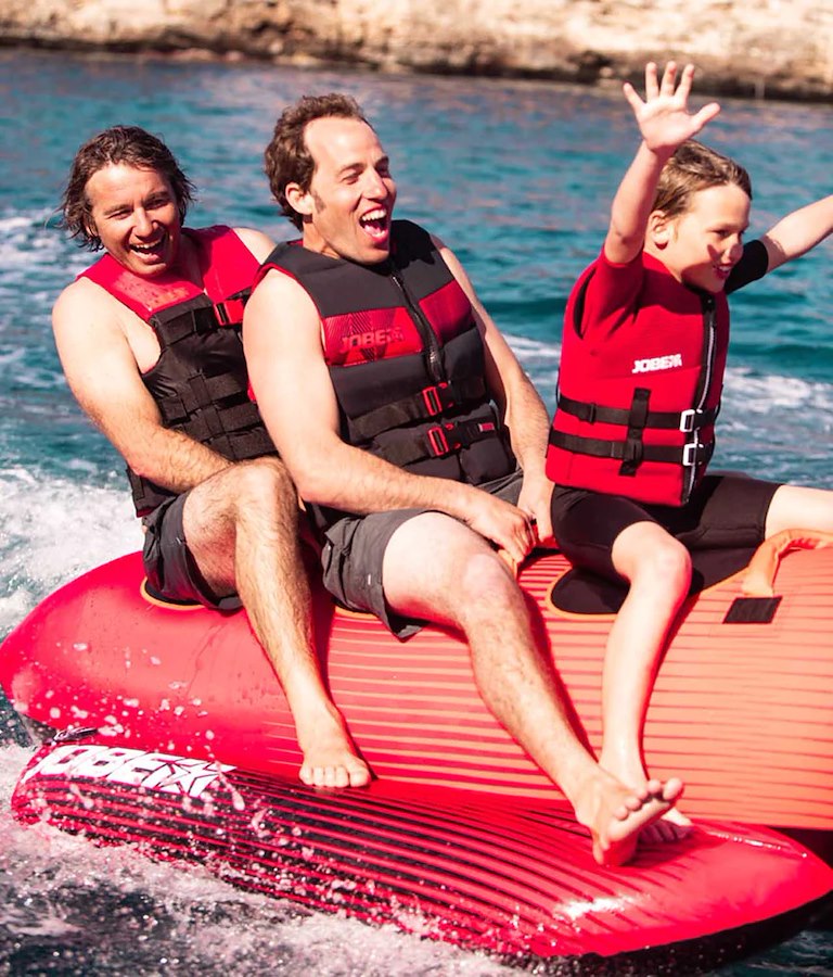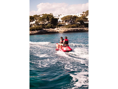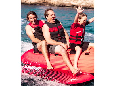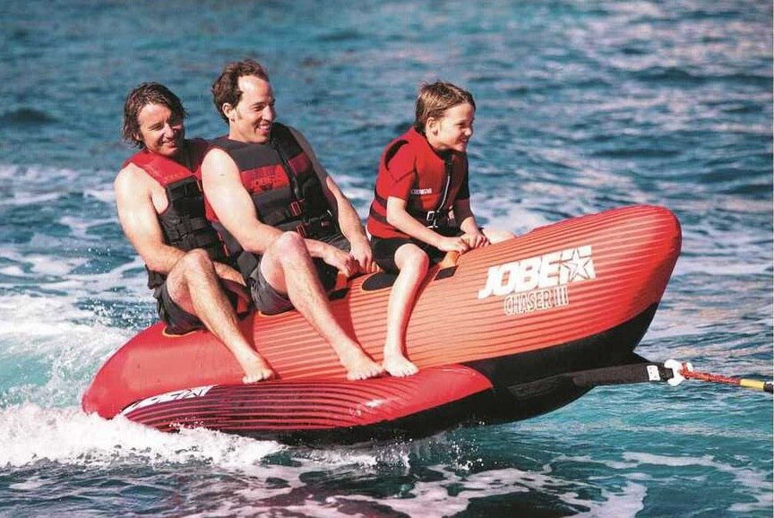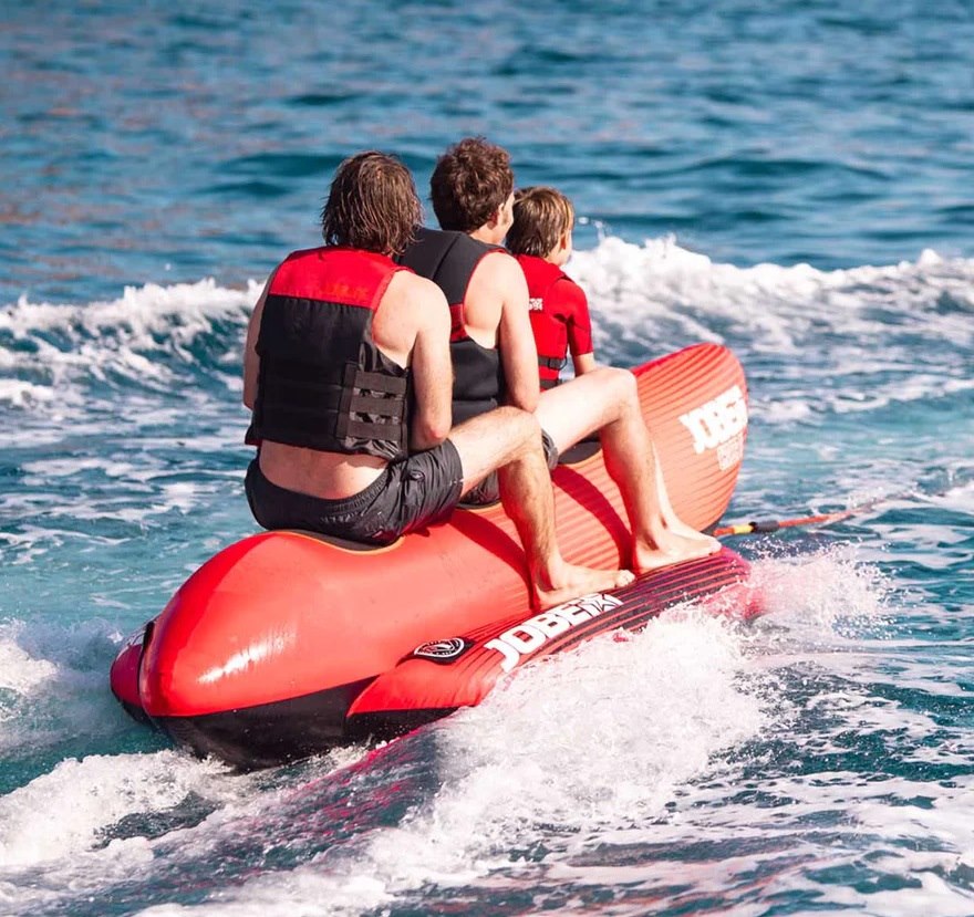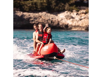 Gonfiabile da traino classico a banana in resistente PVC 28G. Ricoperto con camicia protettiva in Nylon 840D. Dimensioni 302 x 110 cm. Portata massima 3 persone.