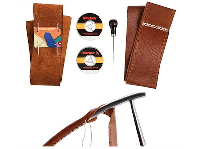 Blister espositivo contenente il necessario per ricoprire i timoni in pelle. Si può scegliere il lato da cucire per avere l’effetto liscio o scamosciato.