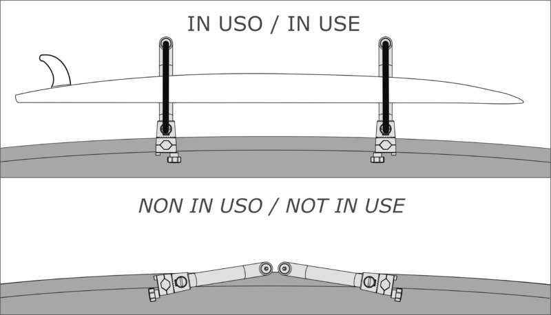 Tramite questo kit si può fissare la tavola o la passerella fuori bordo. Si fissa al corrimano grazie a dei morsetti regolabili a 360°. Il sistema di manopole a sgancio rapido consente a ciascun braccio di essere ruotato immediatamente quando non è in uso o di essere ruotato con un angolo più stretto per adattarsi meglio al SUP o a passerelle più strette. Ogni braccio dispone di una protezioni in PVC schiumato ad alta intensità, che protegge il SUP o la passerella dalle abrasioni e cinghie regolabili e facilmente removibili.