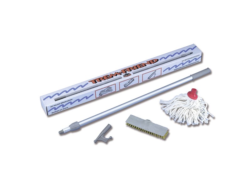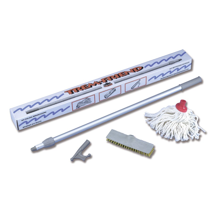 Kit barca in 4 pezzi composto da spazzolone, frattazzo, mezzo marinaio e asta in alluminio. Tutti gli elementi sono intercambiabili e facilmente inseribili sul tubo di alluminio telescopico.