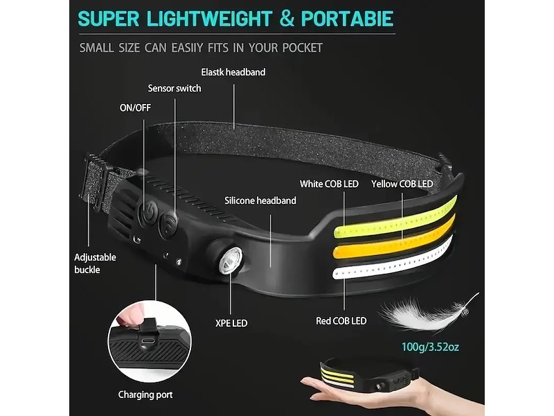 Con una classificazione IPX4, la lampada è resistente agli schizzi d’acqua, perfetta per l’uso sotto la pioggia o in ambienti umidi. Il peso contenuto di soli 100 gr. e la fascia elastica regolabile e antiscivolo assicurano comfort e stabilità anche durante un uso prolungato, sia per adulti che per bambini, con o senza casco.