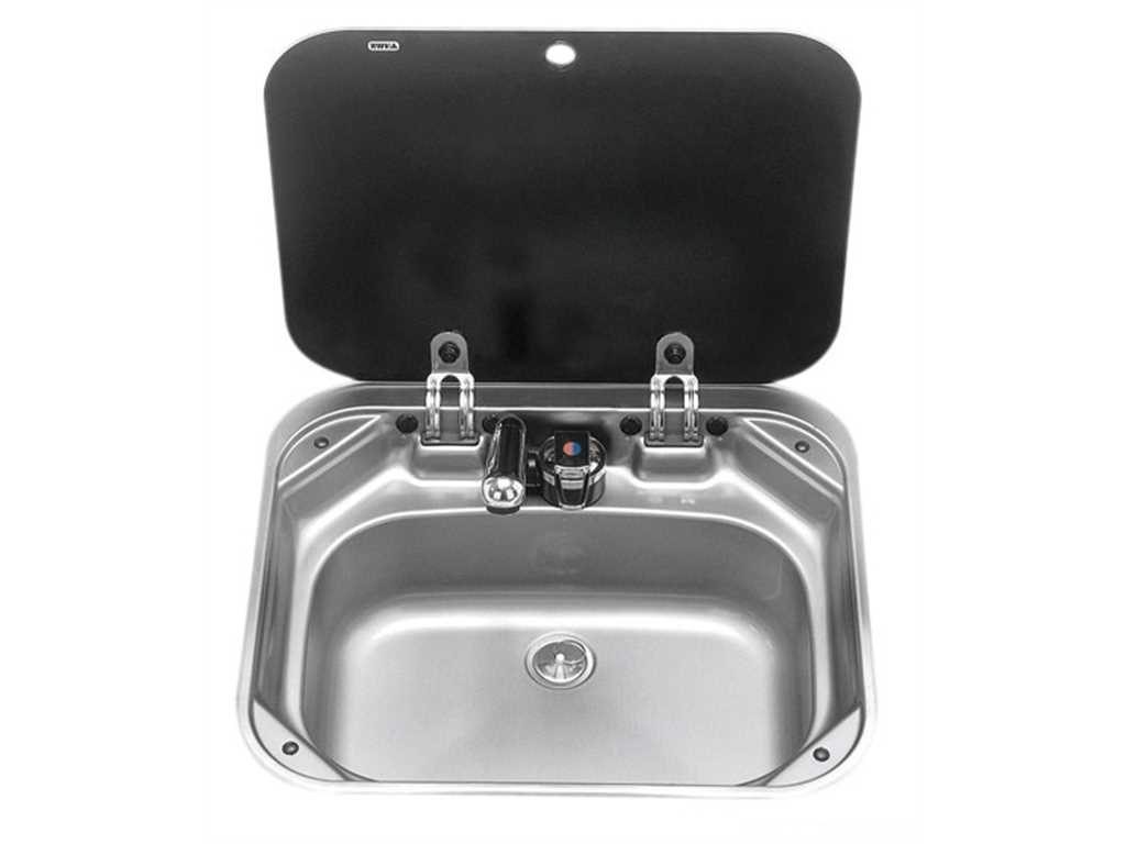 Lavello con vasca in acciaio inox e coperchio in vetro temperato fumè. Completo di rubinetto per acqua calda e fredda.